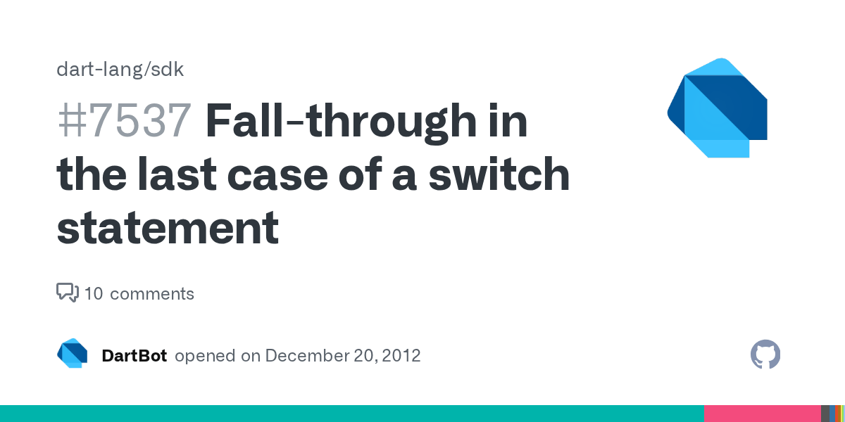 Dart switch statement works with various data types. 21.12.2019 · switch case in dart : Using a switch case statement in place of if else statement can make program look more concise. 01.04.2019 · dart switch case statement is a conditional statement like if else ladder statement but it has multiple conditional statements but the only one can be true. Switch case statements in dart general syntax of switch case statement given … Based on the expression result, it moves to a specific case block. 03.02.2019 · switch case in dart. A switch statement is an alternative of else if statements which allows a variable to be tested for equality against a list of values. Each value is called a case, and the. 29.03.2020 · switch case is one of the control flow statements in dart. The switch block takes one expression and each switch block takes n different case blocks... The value of the variable compares with the multiple cases, and if a match is found, then it executes a block of statement associated with that particular case.